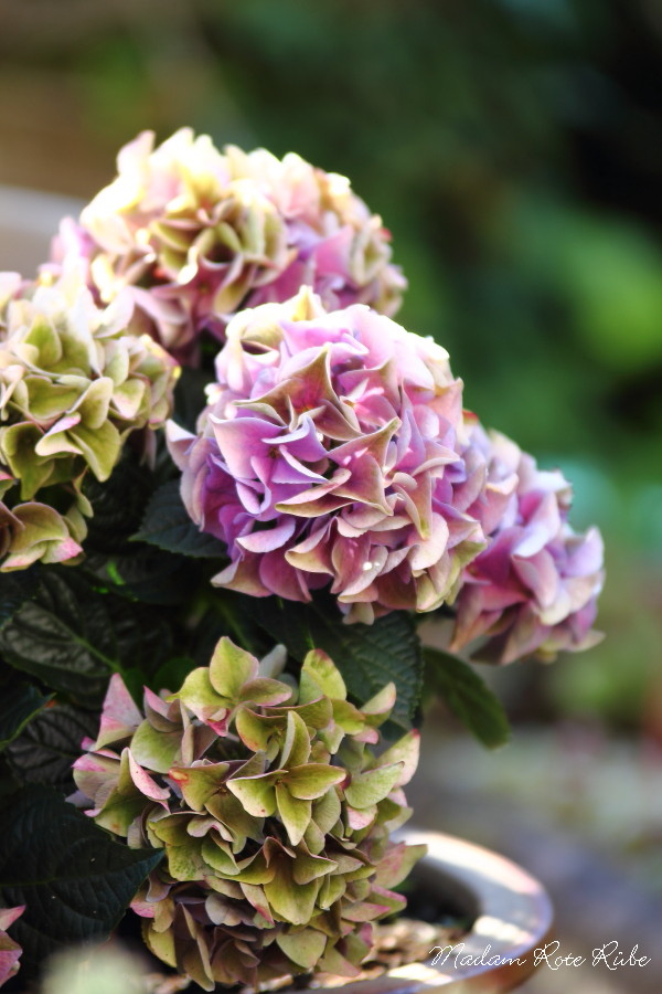 Gesumse um uns herum. Die Gartenhortensien mit ihren prachtvollen Blütenrispen an unserem Sitzplatz erfreuen sich über einen nicht nachlassenden Strom von Schwebfliegen, Hummeln und Wespen auf ihren Staubgefässen. Wir würden das laue Lüftchen, welches um uns herum weht, auch noch mehr genießen, wenn sich die Insekten nicht so schadlos dem köstlichem Fruchtaufstrich auf unseren Brioches widmen würden. Klar, dass es ihnen auch schmeckt, so eine französisch vanillige Vollkorn-Brioche ist unwiderstehlich.