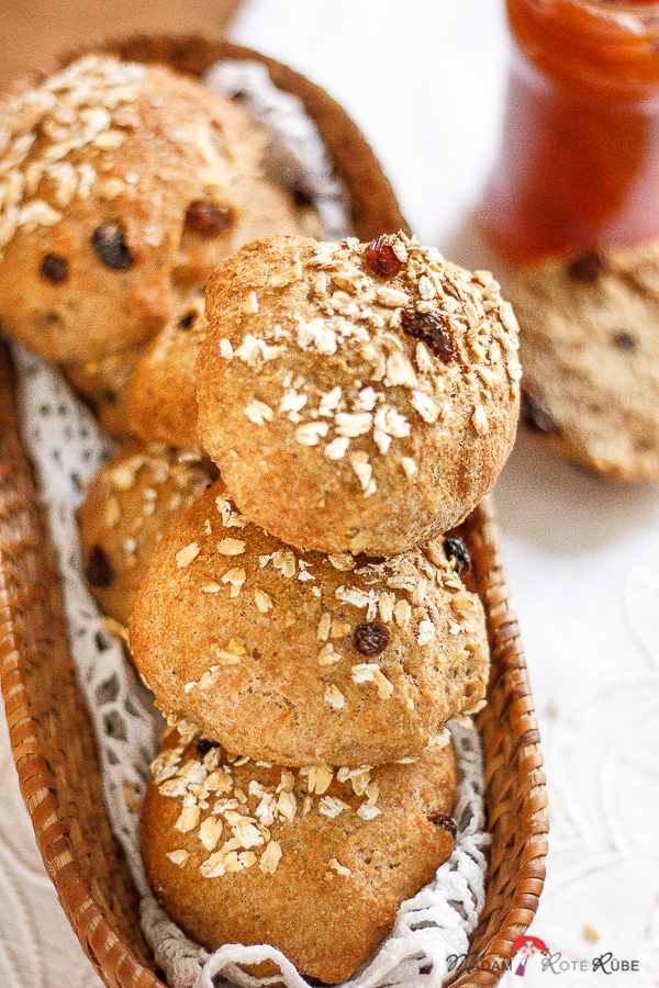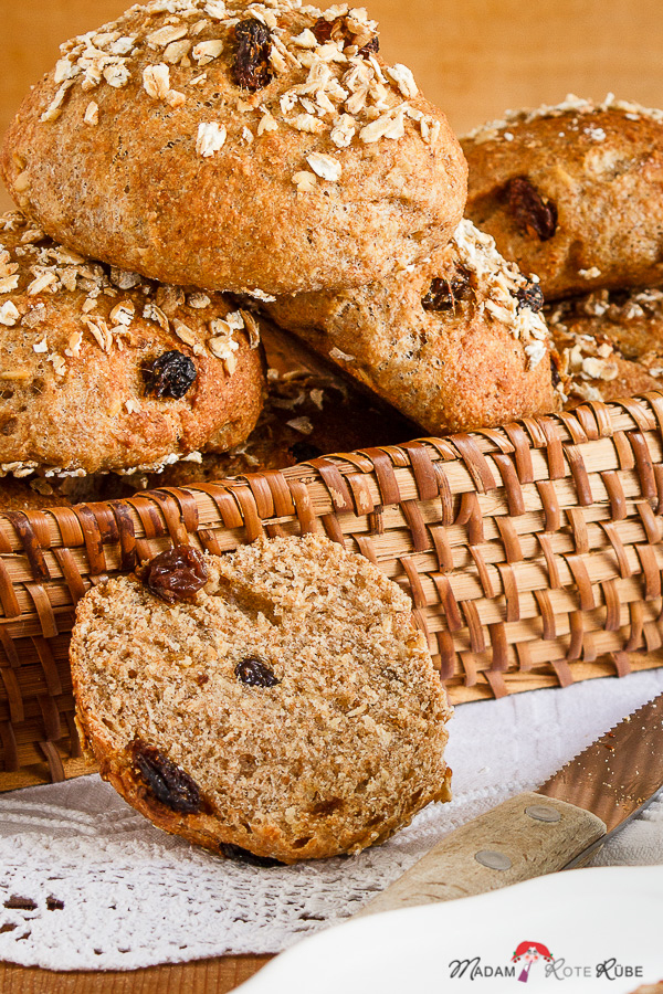 Mit meinem Brötchen-Rezept für das Sonntags-Vollkornbrötchen mit Rosinen und Haferflocken sind deiner Kreativität keine Grenzen gesetzt: Du kannst sie individuell mit den verschiedensten Nüssen verfeinern! Und wenn sich deine Nase bei Rosinen rümpft, weiche auf Cranberrys oder Trockenpflaumenwürfel aus.