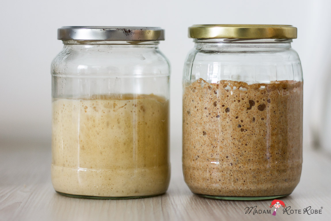 Meist wird sie aus Weizenmehl Type 550 erstellt, und diese Mehltype nutzte ich ebenfalls zu Beginn. Doch als ich bemerkte, dass der Trieb meines Dinkelvollkorns-Lievito madre immer die Nase wegen seinen vielen Milchsäurebakterien und Hefepilzen vorneweg hatte, tauschte ich kurzerhand die Type 550 gegen mein frisch gemahlenes Weizenvollkornmehl aus.