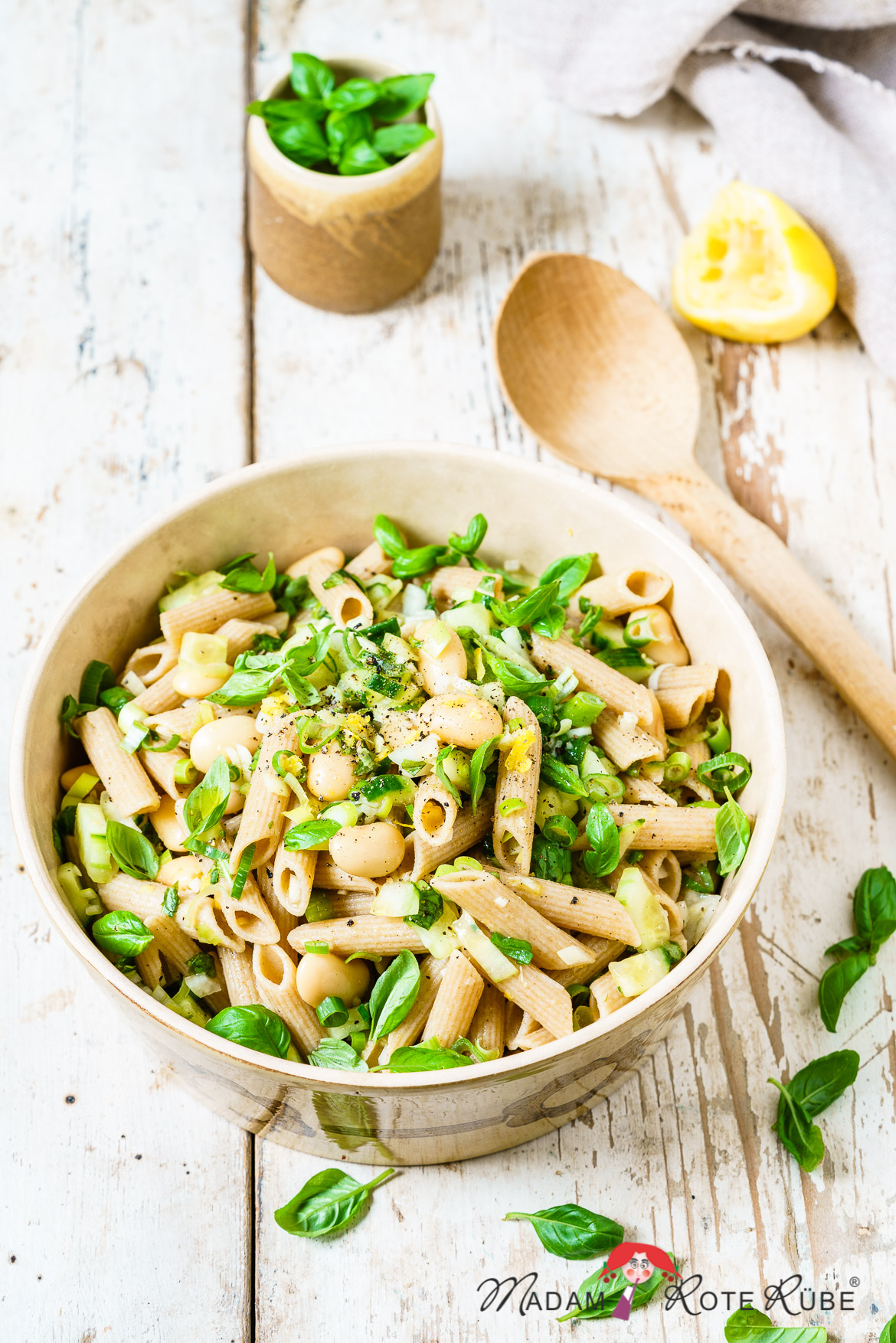 Vollkornnudeln, Salatgurke, weiße Bohnen und viel Basilikum strotzen voller guter Inhaltsstoffe. Allein die weißen Riesenbohnen liefern viel Eisen, Magnesium und reichlich Proteine. Zudem harmonieren sie mit ihrem leicht süßlichen Geschmack und der angenehm weichen mehligen Konsistenz hervorragend mit anderen Zutaten. Besonders Knoblauch, Zitronensaft, Zwiebel und Basilikum unterstreichen hier angenehm ihren milden Geschmack. Jede Menge Ballaststoffe in den weißen Riesenbohnen und in den Vollkornnudeln sind obendrein die Garanten für ein tolles Sättigungsgefühl bei diesem Power-Nudelsalat.