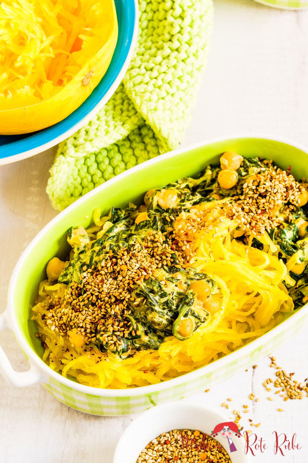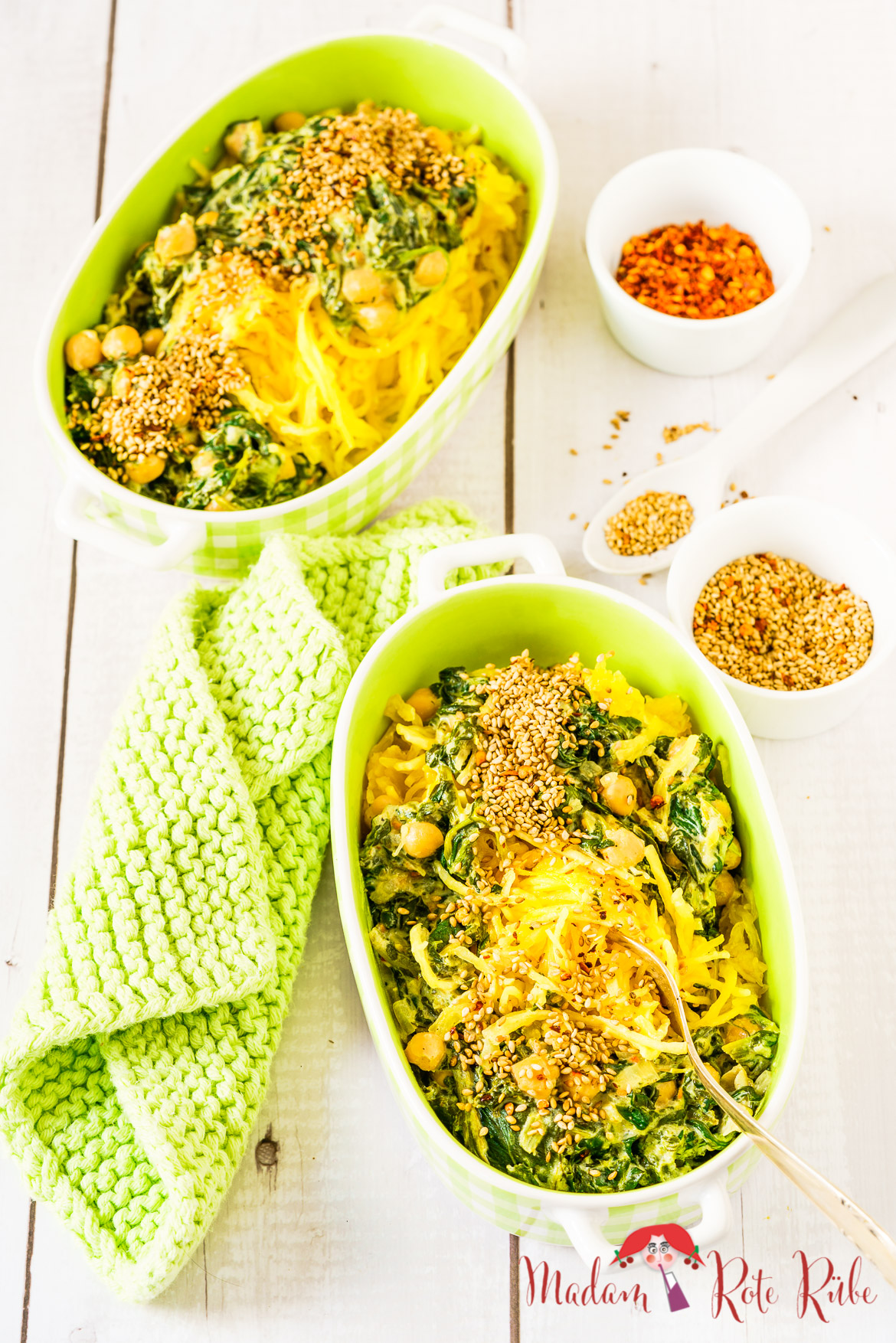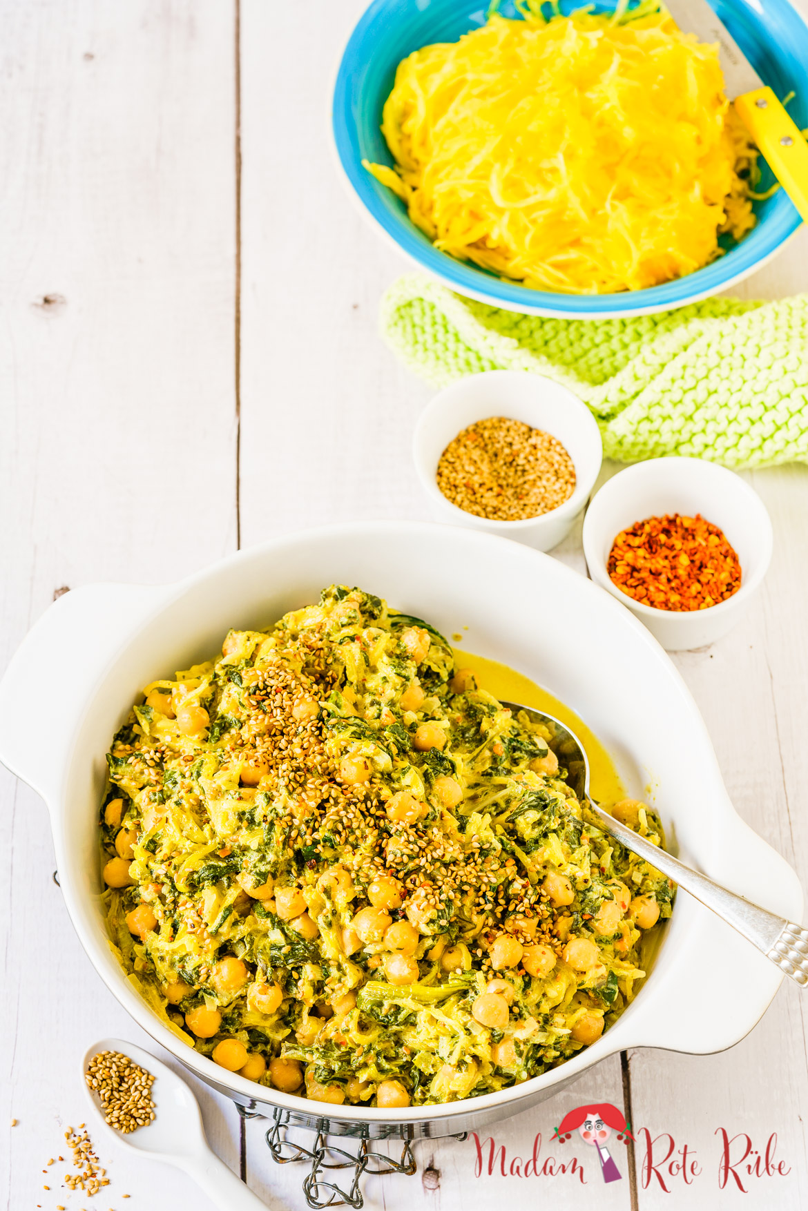 Madam Rote Rübe - Spaghettikürbis mit Spinat, Kichererbsen und Sesam