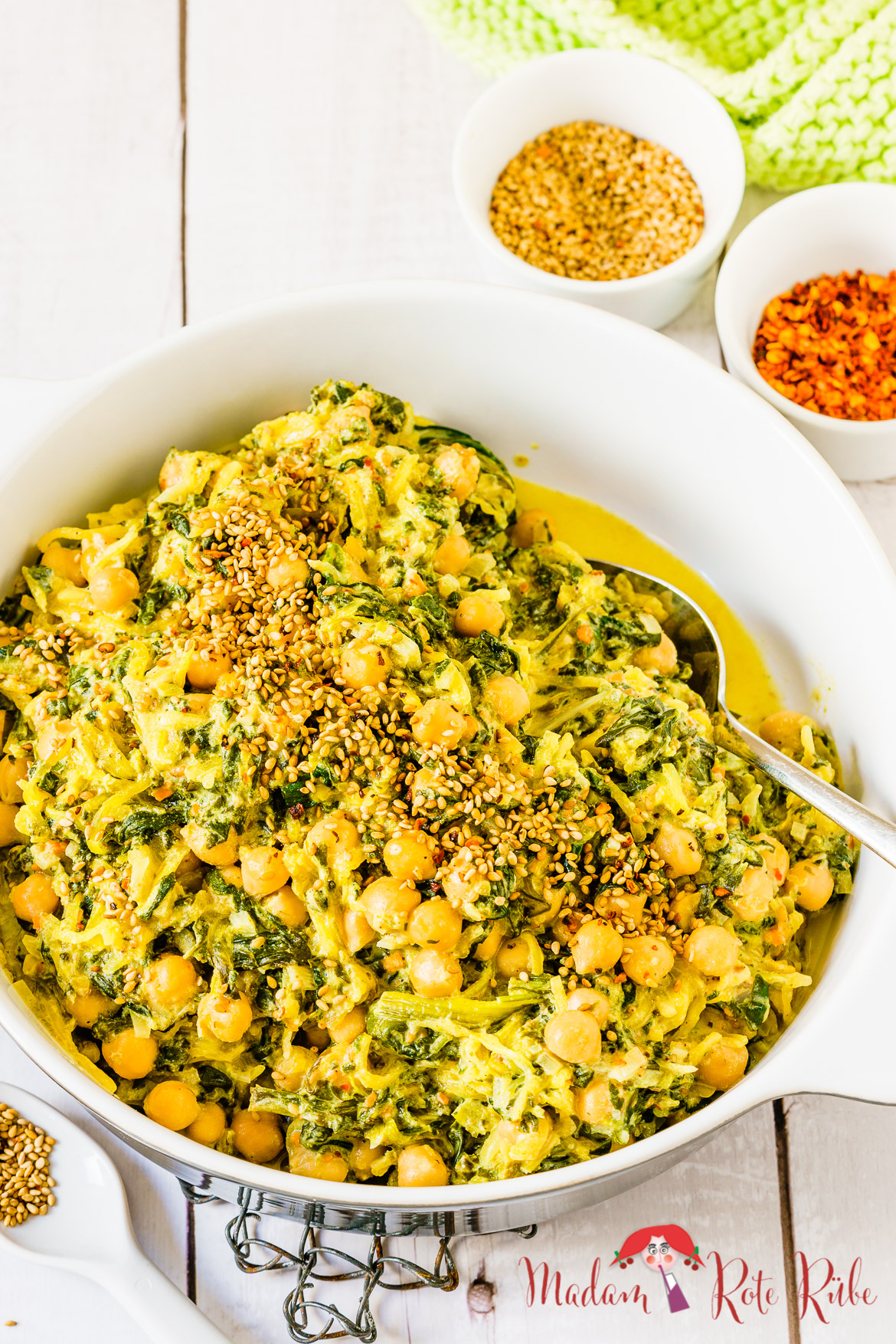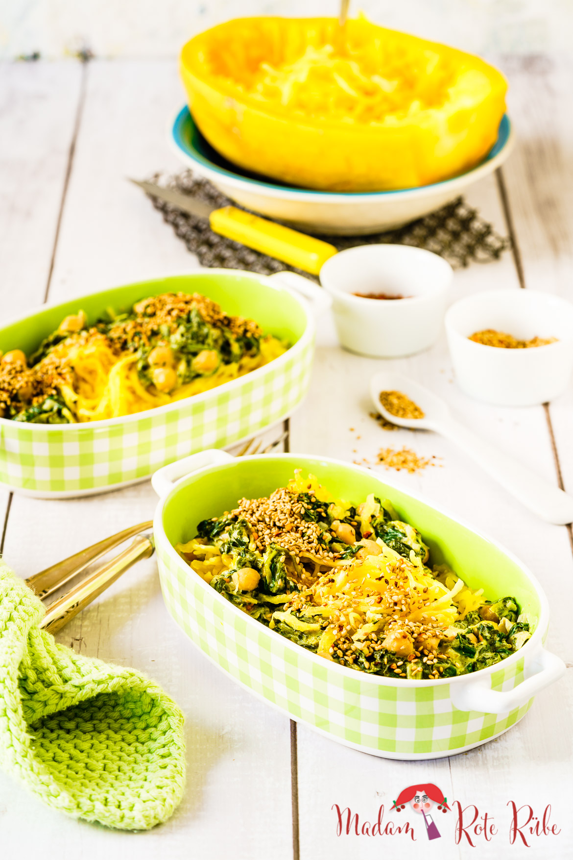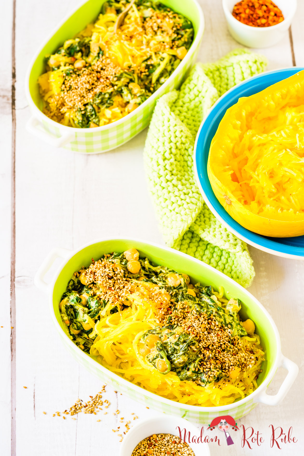 Madam Rote Rübe - Spaghettikürbis mit Spinat, Kichererbsen und Sesam