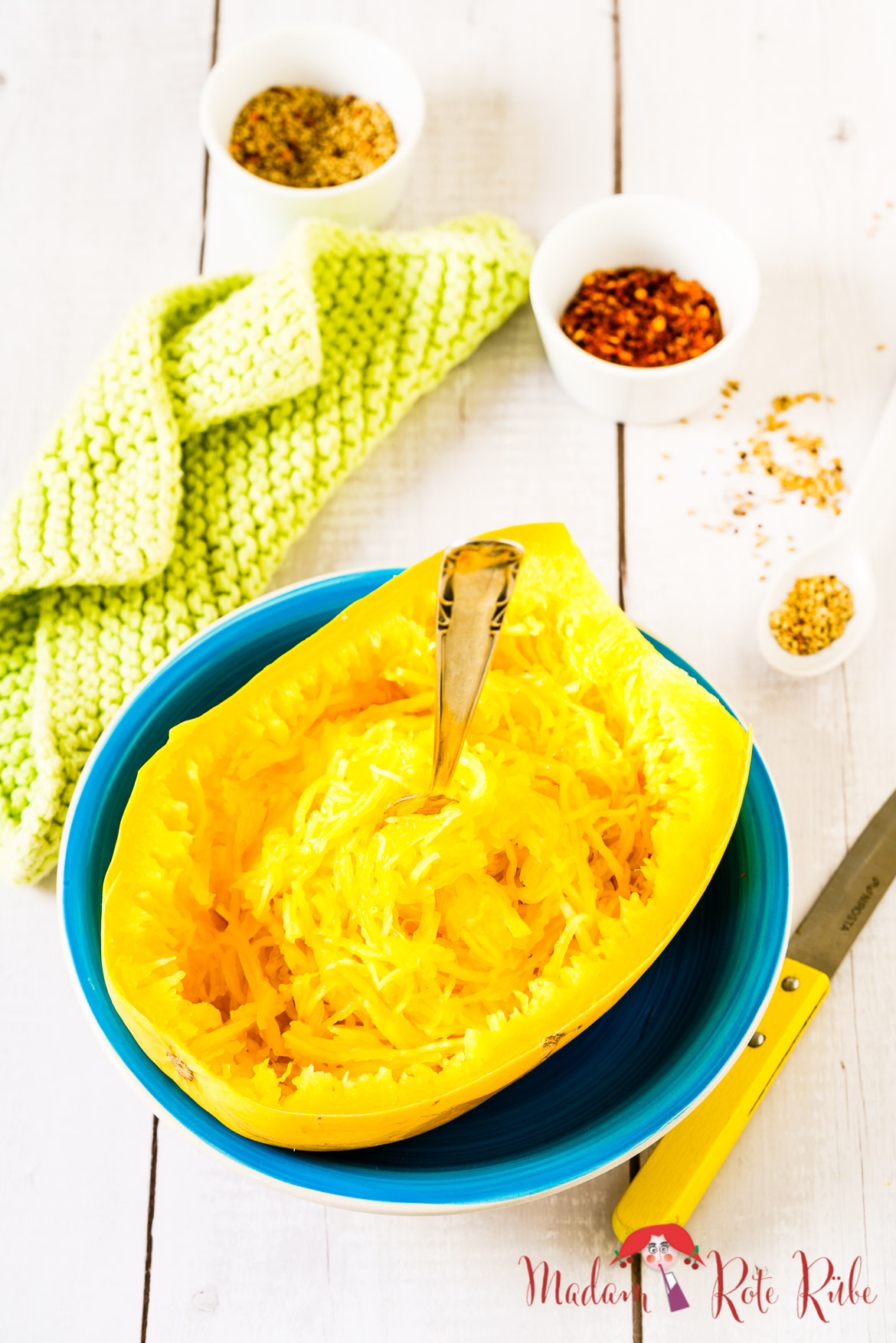 Isst du auch ab und an Spaghettikürbis? Welche Variante bevorzugst du? Aus dem Backofen oder im Topf gegart?